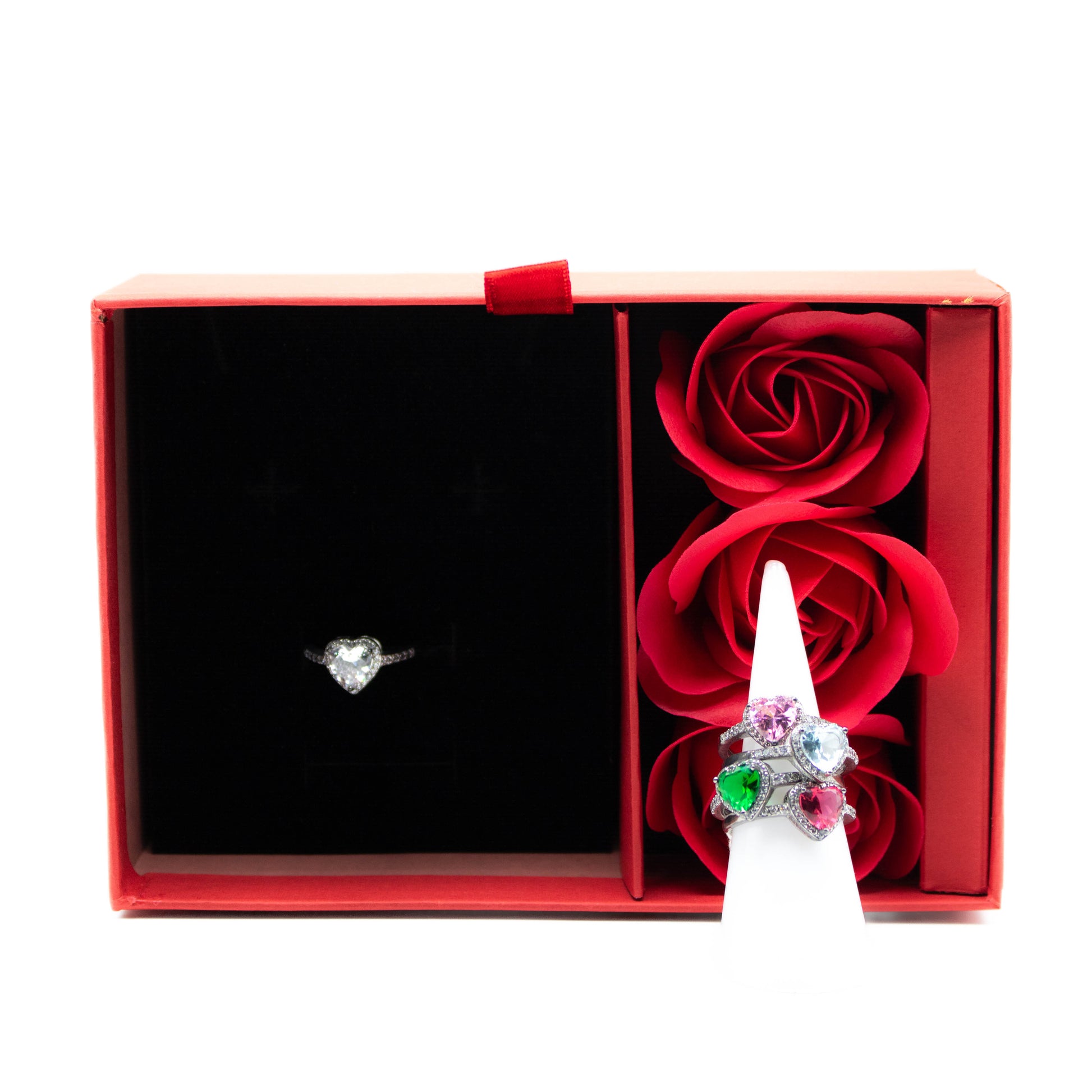 Anello in argento 925 e zircone colorato, disponibile in bianco, turchese, rosa, verde e rosso. Un gioiello prezioso e romantico confezionato in una meravigliosa scatola regalo con rose sintetiche.