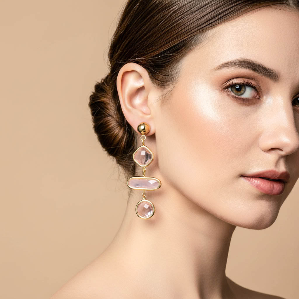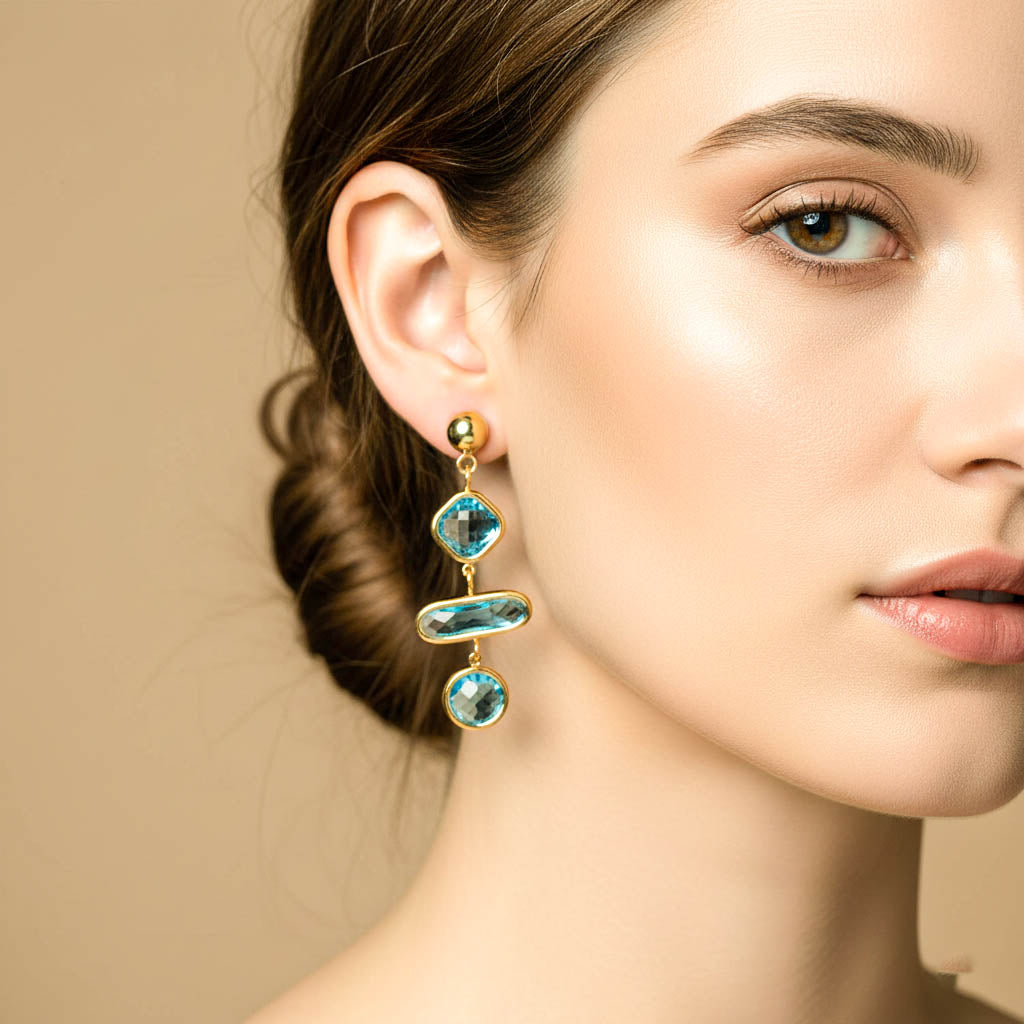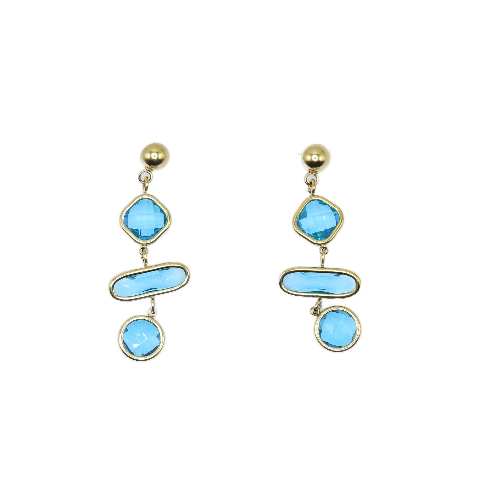 Descrizione: questi orecchini sono realizzati in acciaio inossidabile gold. Leggermente pendenti con cristalli luminosissimi che donano luce ed esaltano la bellezza di chi li indossa. Perfetti per la stagione estiva con i meravigliosi colori pastello nei toni dell'azzurro e del rosa.