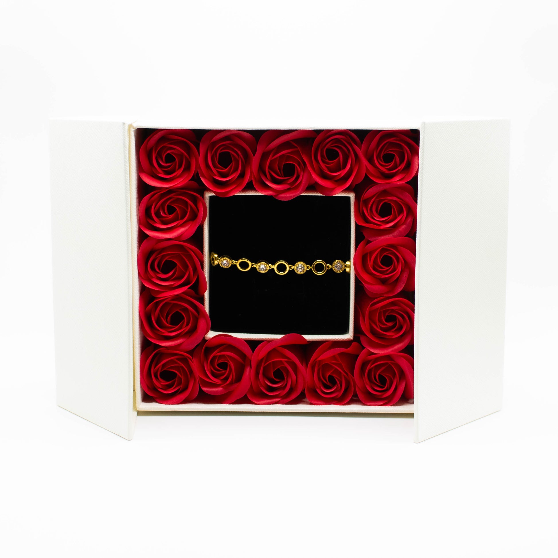 Bracciale in acciaio con zirconi bianchi, raffinato ed elegante, confezionato in una bellissima scatola regalo decorata con roselline rosse sintetiche. ideale per San Valentino